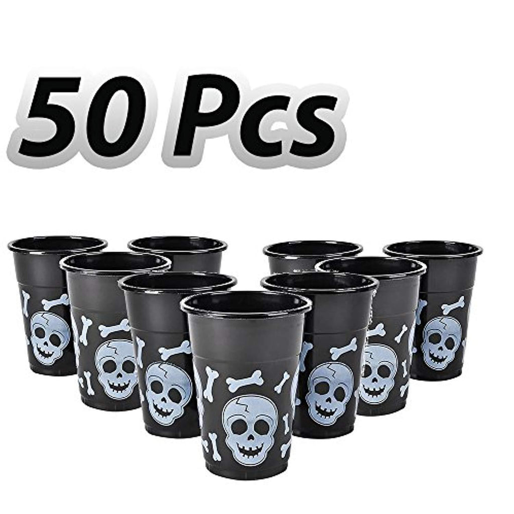 - Includes 50 Halloween Black and White Skull & Cross Bones Plastic Party Cups
