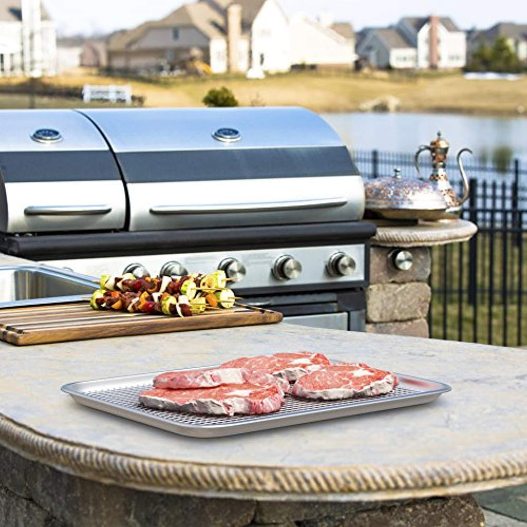 SAFE WITH NO HARMFUL CHEMICALS or metals. The professional grade sheet pan and footed grate are approved for use in both homes and kitchens. Rest assured the units are made without harmful metals and are free of toxic chemicals, helping to keep your food healthy. The all-around high-quality baking tray measures 12-1/4 inches x 17-1/8 inches and will instantly become a deeply treasured part of your kitchen. Proudly serving large and small groups.