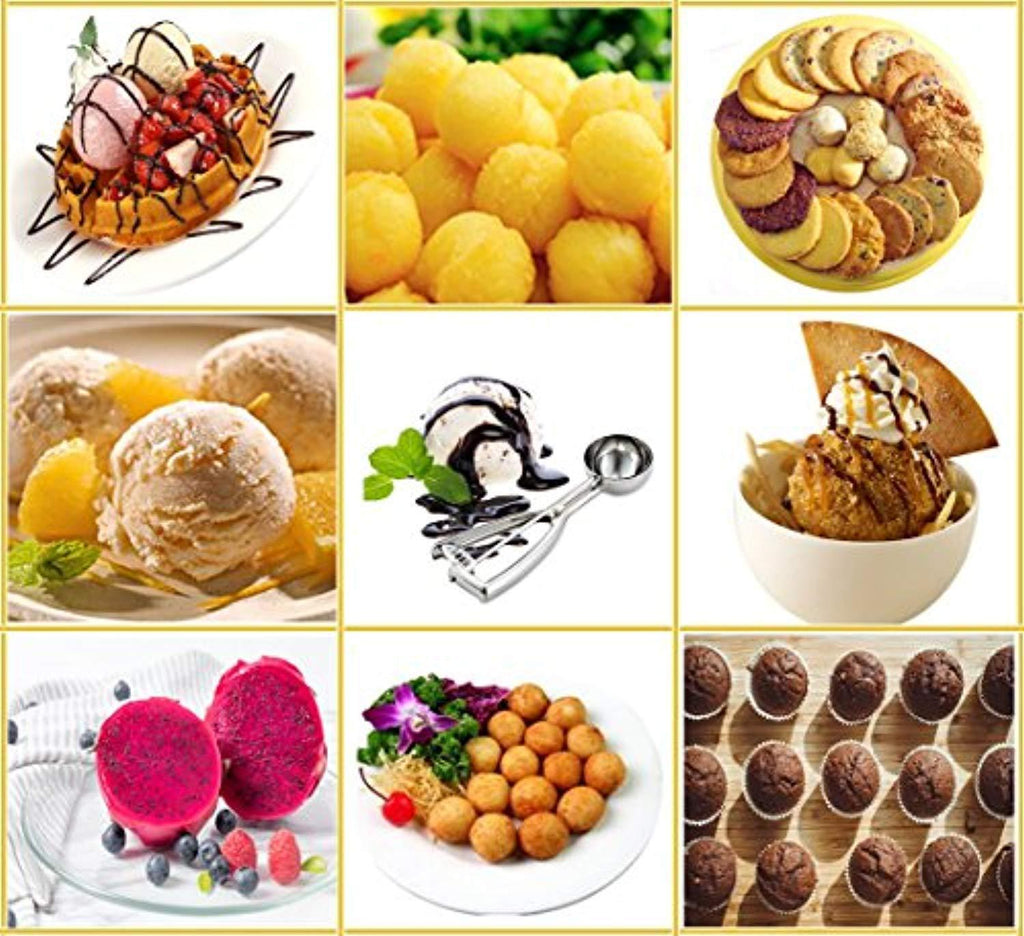 MULTIPLE USES, IDEAL KITCHEN TOOL - With H-Min ice cream scoop stainless steel, we would use it to make beautifully rounded balls of ice cream, sorbet, fruit, and meatballs, melon ball, and perfectly portioned cookies, cupcakes, muffins, and more. They are small ice cream scoop, small cookie scoop, melon baller, sorbet scoop and cupcake scoop also. In short, it is a great versatile kitchen tool