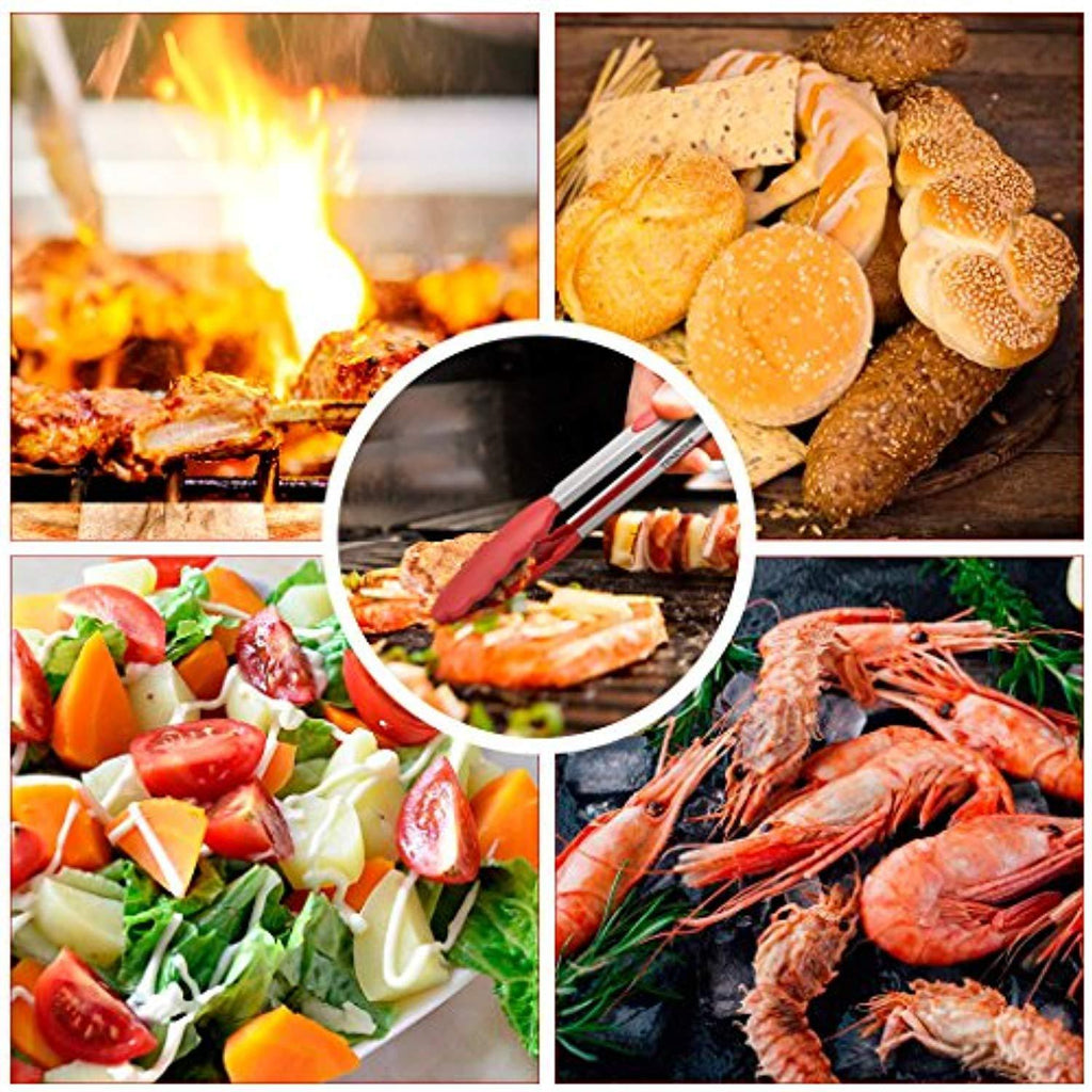 ♥ GOOD GRIP AND CONTROL FOOD SILICONE KITCHEN TONGS - premium 304 stainless steel construction and silicone clamp finished.The barbecue tongs can withstand years of use; Non-slip surface and wave design offer you the best control on food,corrosion resistant.