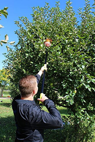 ADJUST LENGTH: Entire assembly extends from 4.5 feet to 13 feet (1.4m to 4m) with the telescoping pole; Unlock the yellow locking buckle, extend or contract to desired length, and lock; Completely adjustable for fruit trees of different heights including apples, lemons, oranges, papayas, peaches, avocados, mangoes, ackees, grapefruit, and other tree fruits without a dangerous ladder