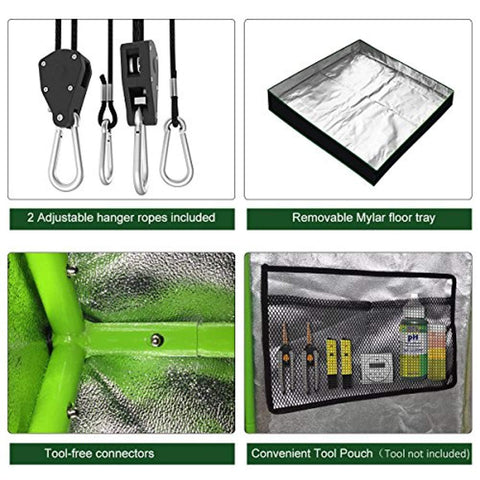 An Upgraded Version & Warranty: 2-year warranty! Return or refund can be negotiated it if your expectations are not exceeded. NOTE: Carbon filter, grow light and aluminum duct are for demonstration purpose only, not included. Accessories Included: 1 removable floor tray, 2 adjustable rope hangers and tool bag on the internal face. PLEASE BE NOTED THAT: This is an upgraded version. Compared with the former version, 2 adjustable rope hangers, tool bag and observation window are added.