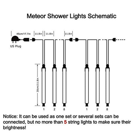 【Meteor Shower Romantic Effect】Led meteor shower lights,the lights of every tubes turns on and off one by one by turns and quickly just like meteor shower or falling rain in the night sky,very beautiful.It can be used as one or be connected as much as 5 string lights.