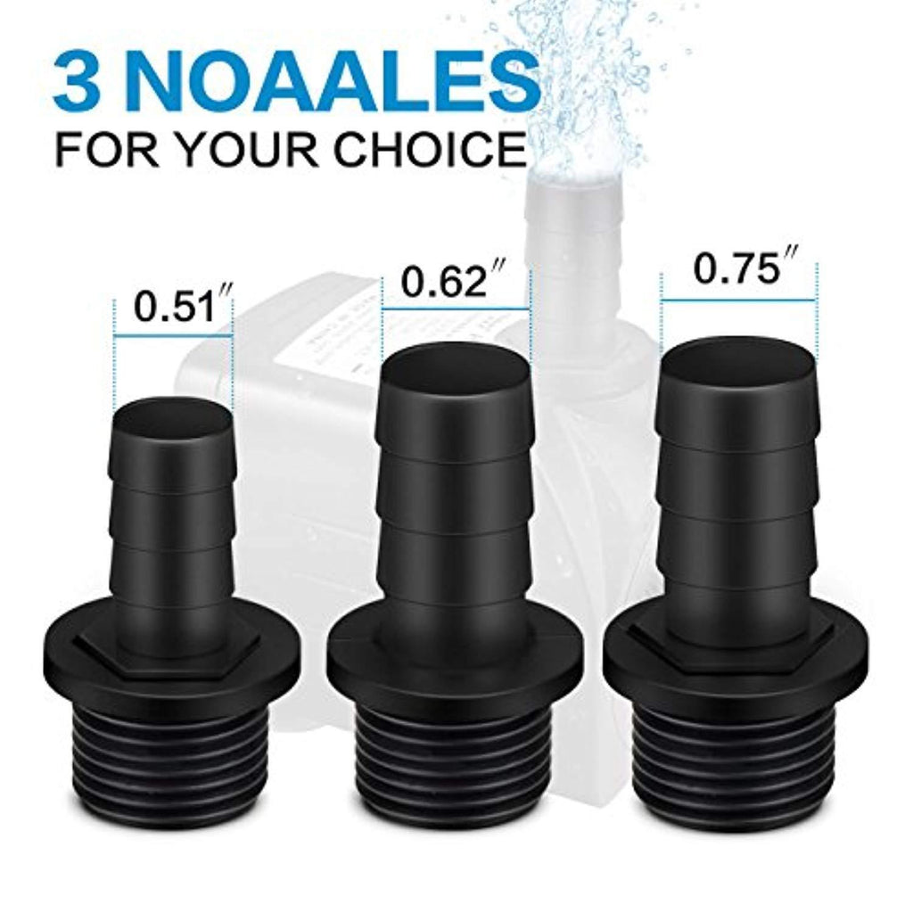 【Water Flow Control】-- Rotate the knob to adjust the water flow rate, so you can get just the water pressure you want. Maximum flow rate: 300 GPH(1200L/H). Equipped with 3 nozzles (13mm;16mm;19mm)for your choice. The Submersible Water Pump can elevate column of water up to 4.9ft ( 1.5m)