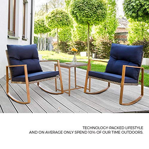 SUNCROWN Outdoor Rocking Chair Set 3-Piece Patio Bistro Set: Grey Wicker Patio Furniture W/Wood-Grain Arm Rest - Two Chairs with Glass Coffee Table (Nautical Navy Cushion)