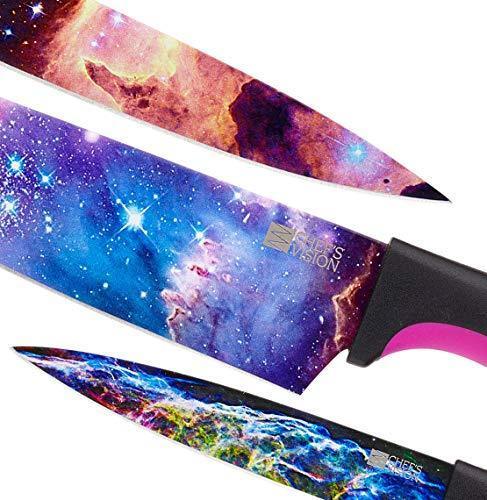 WHAT A BEAUTIFUL VALUE! First, you marvel at the beauty of Chef’s Vision Knives, with each colorful blade displaying a stunning color image of the unfolding universe. But the best is yet to come — because Chef’s Vision Knives perform as beautifully as they look! They’re more than the most gorgeous knives you and your kitchen have ever seen, their superior materials, ergonomic design and quality manufacturing make Chef’s Vision a fabulous value, one you’ll appreciate every time you use them.