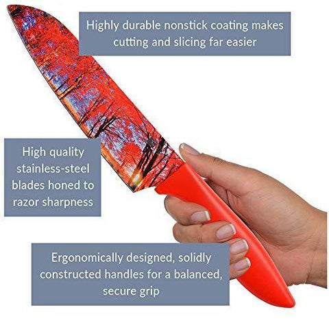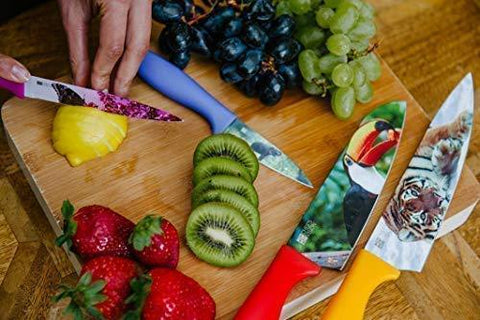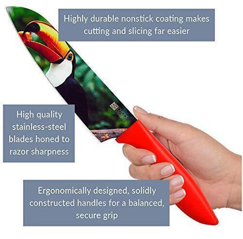 WHAT A GREAT NON-STICK COATING! Another beautiful attribute of the beautiful pictures on each blade is that they also serve as a highly durable nonstick coating, which makes cutting, slicing and paring far easier, so even the thinnest cucumber slice just slides right off the blade! Imagine how much faster, easier and enjoyable Chef’s Vision knives will make all your food preparation. So the sheer pleasure of cooking will be enhanced — another beautiful advantage of using Chef’s Vision Knives.